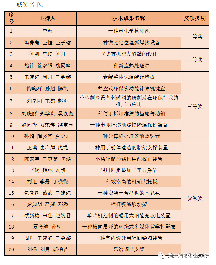 在2018年由葫蘆島市總工會(huì)和葫蘆島市科學(xué)技術(shù)局聯(lián)合開展的“市職工技術(shù)創(chuàng)新成果評選活動(dòng)”中,我院共有20項(xiàng)職工技術(shù)創(chuàng)新成果獲獎(jiǎng)。紀(jì)監(jiān)審李輝主持的《一種電化學(xué)檢測池》和材料工程系馮菁菁主持的《一種激光定位埋弧焊接設(shè)備》研究成果分獲一等獎(jiǎng);機(jī)電工程系劉凱、材料工程系熊偉主持的研究技術(shù)成果均獲得二等獎(jiǎng);船舶工程系王建紅等6項(xiàng)研究技術(shù)成果均獲得三等獎(jiǎng);船舶工程系王璞等10項(xiàng)研究技術(shù)成果均獲得優(yōu)秀獎(jiǎng)。