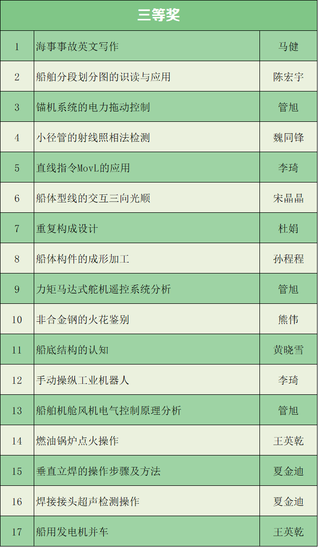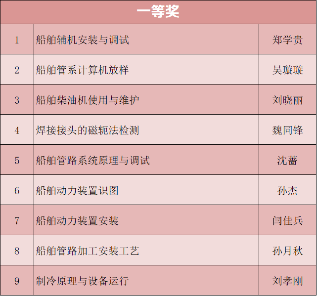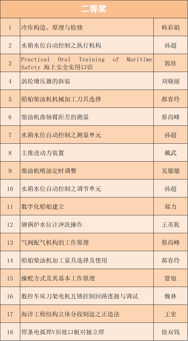 近日,中央電教館職業(yè)崗位能力精品課驗(yàn)收工作落下帷幕。該項(xiàng)目共收到來自19個(gè)省(區(qū)、市)和新疆生產(chǎn)建設(shè)兵團(tuán)共43所職業(yè)院校提交的514件作品,驗(yàn)收結(jié)果共有468門通過,我院就占了136門,通過率100%。其中《船舶輔機(jī)安裝與調(diào)試》等9門精品課獲一等獎(jiǎng),《冷庫構(gòu)造、原理與檢修》等18門精品課獲二等獎(jiǎng),《海事事故英文寫作》等17門精品課獲三等獎(jiǎng)。