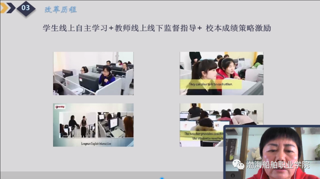 李桂杰教授在線直播作題為《線上線下教學(xué)模式下高職英語改革研究》的專題講座,從船院簡介、改革背景及原則、改革歷程、思考與展望四部分內(nèi)容系統(tǒng)地介紹了我院英語教學(xué)改革與發(fā)展歷程,分享在線教學(xué)經(jīng)驗。