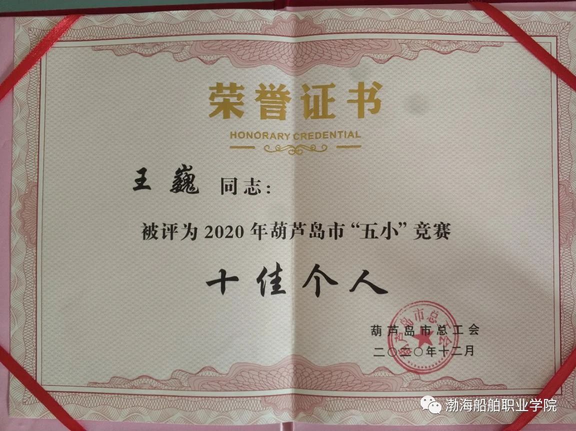 2020年12月葫蘆島市總工會(huì)在全市開展表彰2020年工人先鋒號(hào)及“五小”競(jìng)賽、勞動(dòng)和技能競(jìng)賽活動(dòng)中表現(xiàn)突出的先進(jìn)集體和個(gè)人活動(dòng)。我院機(jī)電工程系王巍老師參與“五小”競(jìng)賽(“五小”競(jìng)賽即“小發(fā)明、小創(chuàng)造、小革新、小設(shè)計(jì)、小建議”創(chuàng)新競(jìng)賽活動(dòng))被評(píng)選為十佳個(gè)人,同時(shí)被授予“葫蘆島市五一勞動(dòng)獎(jiǎng)?wù)隆薄?/p>
