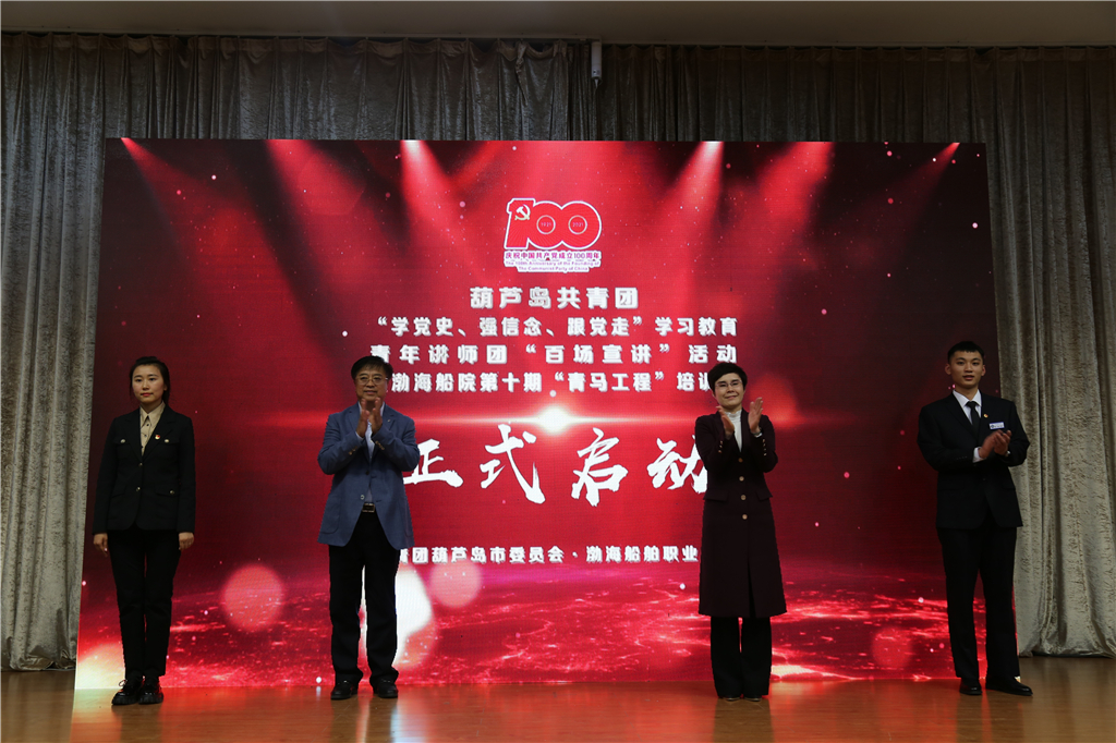 隨著團市委書記李嬌嬌、學院黨委書記李榮軍、講師代表畢薔、學生代表田浩上臺共同按下啟動按鈕,葫蘆島共青團“學黨史、強信念、跟黨走”學習教育青年講師團“百場宣講”活動暨渤海船院第十期“青馬工程”培訓班正式啟動。