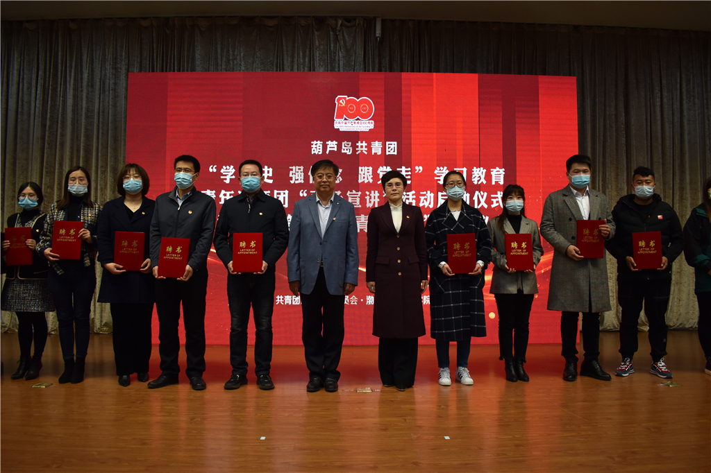 儀式上,團市委書記李嬌嬌、學院黨委書記李榮軍為葫蘆島共青團“學黨史、強信念、跟黨走”學習教育青年講師團代表頒發(fā)了聘書。