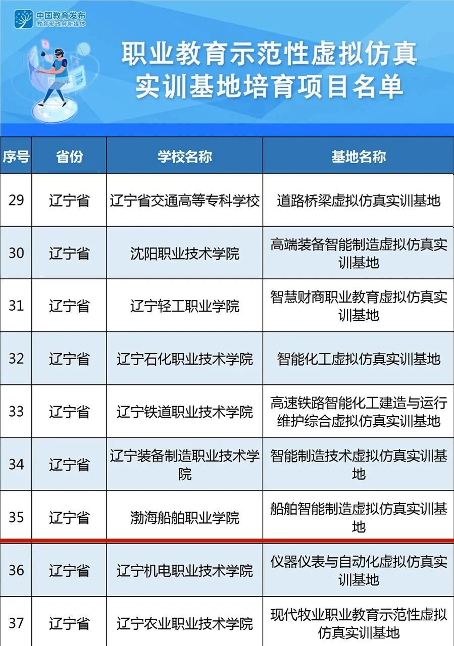 近日,經各省推薦、線上線下專家遴選等程序,教育部確定職業(yè)教育示范性虛擬仿真實訓基地培育項目215個。其中,遼寧獲批職業(yè)教育示范性虛擬仿真實訓基地培育項目9個,我院船舶智能制造虛擬仿真實訓基地名列其中。