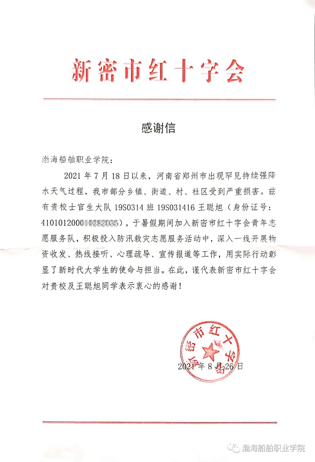 近日,學(xué)院收到新密市紅十字會發(fā)來的感謝信,感謝我院士官生大隊(duì)19S0314班學(xué)員王聰旭積極投入防汛救災(zāi)志愿服務(wù)活動中,用實(shí)際行動彰顯了新時代大學(xué)生的使命與擔(dān)當(dāng)。