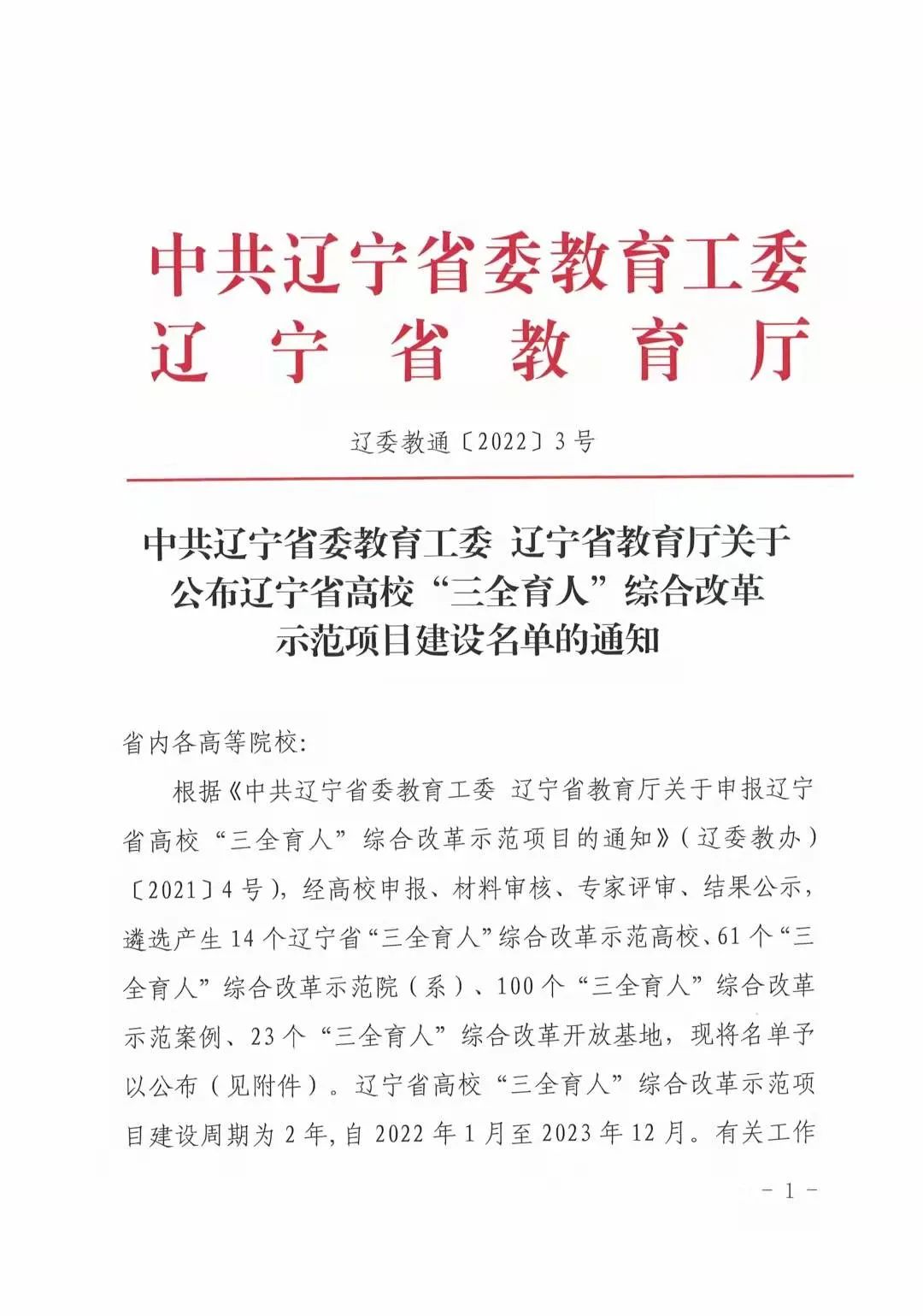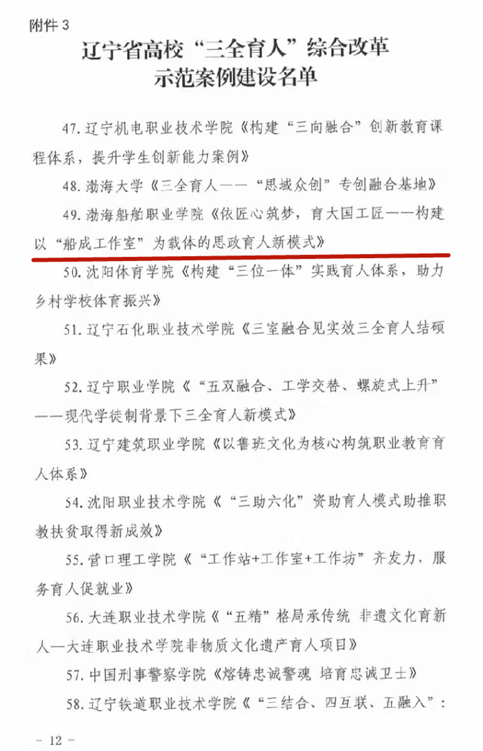 1月18日,省委教育工委、省教育廳公布了遼寧省高校“三全育人”綜合改革示范項目建設(shè)名單,我院案例《依匠心筑夢,育大國工匠——構(gòu)建以“船成工作室”為載體的思政育人新模式》成功入選遼寧省“三全育人”綜合改革示范案例。