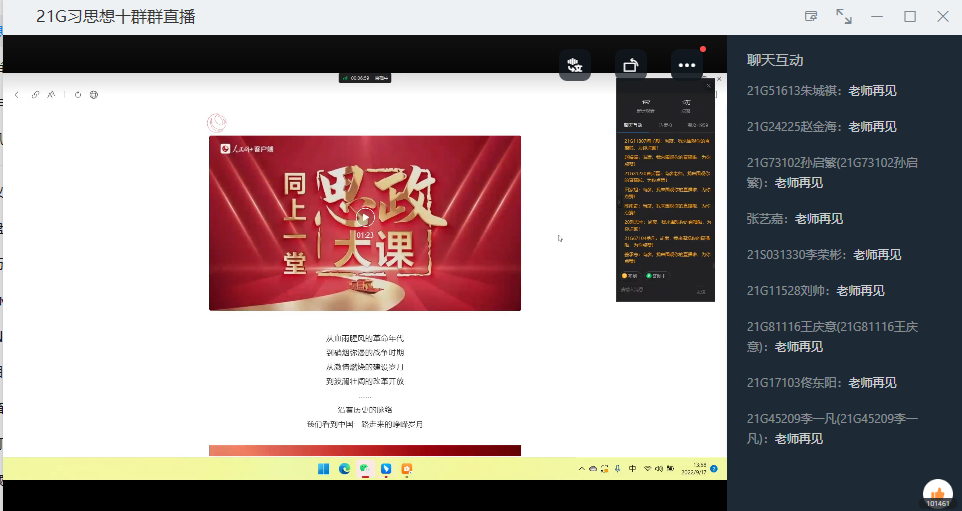 課程利用微信群等線上渠道,各班級召開以班會等為形式的主題討論活動。本次授課厚植學(xué)生的愛國主義情懷,引導(dǎo)學(xué)生堅定四個自信,接好歷史接力棒,不負青年一代的責(zé)任與擔(dān)當(dāng)。同時也增強了教師們對職業(yè)教育的信心,以實際行動迎接黨的二十大勝利召開。
