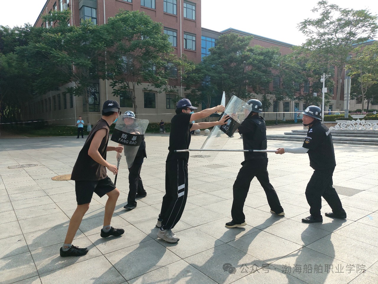 兩名“不法分子”跳過欄桿闖入校園,視頻監(jiān)控室值班員第一時間發(fā)現(xiàn)險情,立即將情況報告給安全保衛(wèi)處,安全保衛(wèi)處領導迅速研判形勢并立即啟動反恐防暴應急預案,安保人員和校衛(wèi)隊隊員快速反應,攜帶鋼叉、盾牌等防暴工具攔截并控制住“不法分子”,同時通過廣播緊急疏散現(xiàn)場師生及其他無關人員。