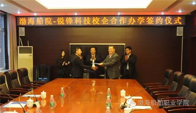 高文良院長與李雪峰總經理共同簽署了《渤海船舶職業(yè)學院與遼寧銳鋒科技有限公司校企合作協(xié)議書》。