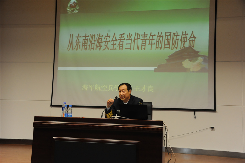 本次報告會,由遼寧省國防教育講師團(tuán)成員、海軍政治理論教學(xué)研究專家組成員、海軍航空兵學(xué)院王才良教授主講。王教授圍繞南海問題、朝核問題等熱點,深入淺出、引經(jīng)據(jù)典,從歷史和現(xiàn)實的兩個角度闡述了國家安全和民族復(fù)興的關(guān)系問題,指出當(dāng)代青年應(yīng)承擔(dān)的國防使命。報告生動精彩,學(xué)生深受鼓舞。