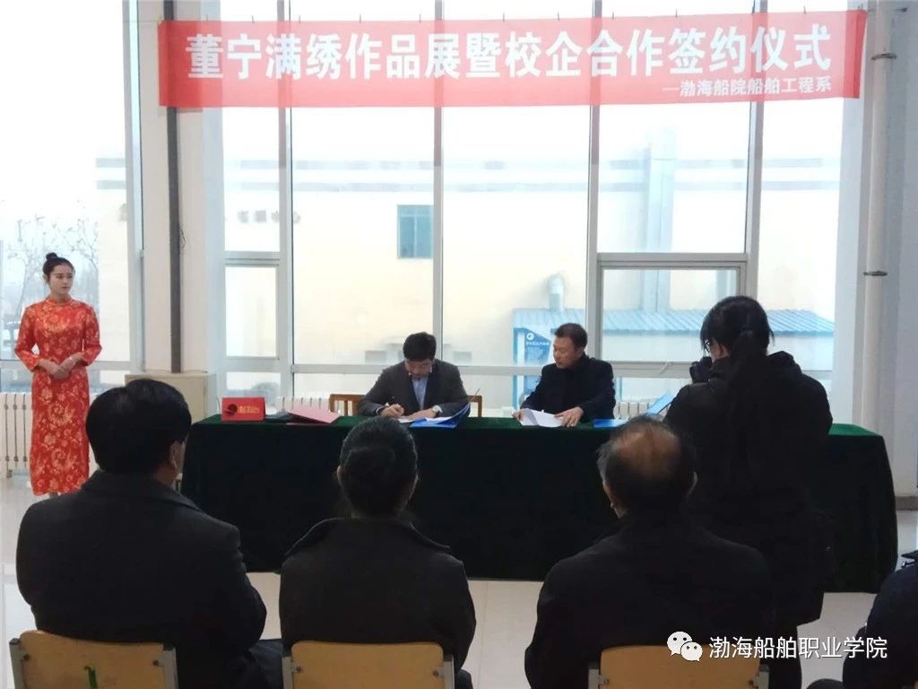 校企雙方代表船舶工程系主任楊文林和許飛經(jīng)理共同簽訂“董寧滿族刺繡文化傳承工作室合作協(xié)議書”。