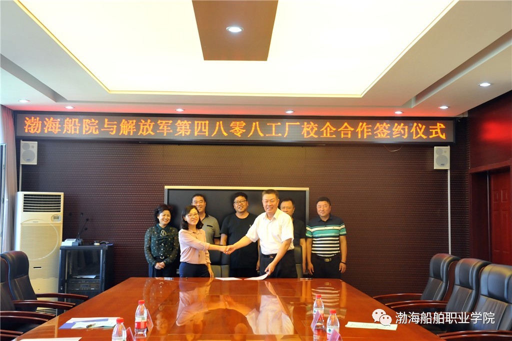 高文良院長與溫麗亞處長共同簽署了《渤海船舶職業(yè)學院與中國人民解放軍第四八零八工廠校企合作協(xié)議書》。