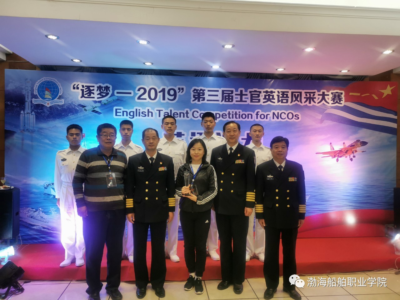 11月16日,逐夢(mèng)深藍(lán)—2019第三屆士官英語風(fēng)采大賽在安徽蚌埠海軍士官學(xué)校舉行,我院由士官生大隊(duì)大隊(duì)長(zhǎng)司衛(wèi)華擔(dān)任領(lǐng)隊(duì),基礎(chǔ)部郭欣擔(dān)任指導(dǎo)老師,2018300101班許中男、2018300101班鄭溢鵬、2018300101班胡泊、19S242班梁晨、19S241班劉凱文五名士官生組成的代表隊(duì)參加了大賽。經(jīng)過激烈角逐,我院代表隊(duì)榮獲團(tuán)體第四名、最佳英語秀銅獎(jiǎng),梁晨同學(xué)獲得單項(xiàng)第五名、“英語口語達(dá)人”銅獎(jiǎng),胡泊同學(xué)獲得單項(xiàng)第八名、“英語百科達(dá)人”銅獎(jiǎng)。