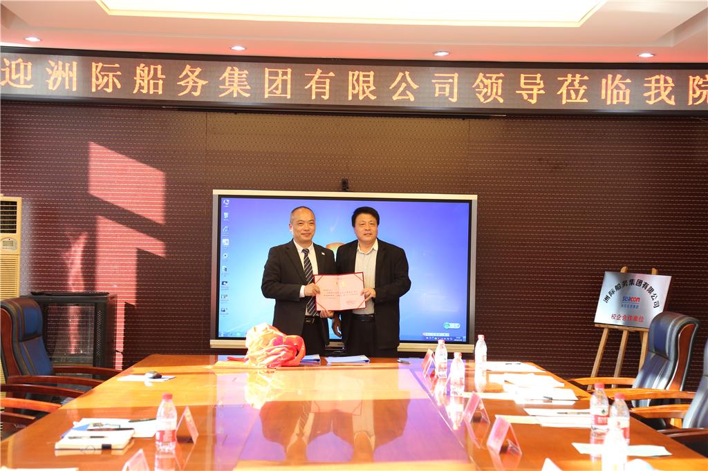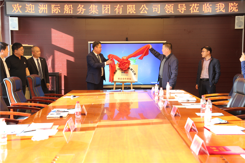 高文良院長與譚軍經(jīng)理代表校企雙方簽署《渤海船舶職業(yè)學院與洲際船務集團有限公司校企合作協(xié)議書》,并為“洲際船務集團有限公司校企合作單位”揭牌。