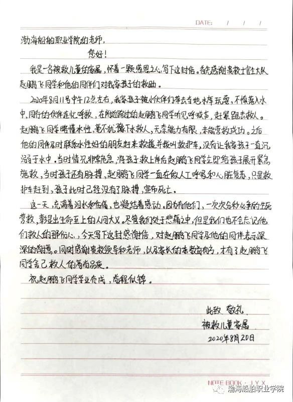 一位落水兒童的家屬將感謝信寄來學校,以感謝士官生大隊19S0241班趙鵬飛同學對她孩子的救助。