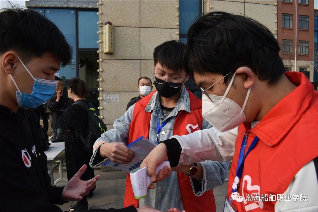 學(xué)院嚴(yán)格執(zhí)行疫情防控要求,由志愿者同學(xué)依照程序?qū)忌M(jìn)行體溫測量、登記。考生們佩戴口罩、配合檢測登記,有序進(jìn)入校園。