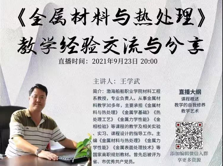 9月23日晚8時,我院材料工程系王學(xué)武老師應(yīng)機(jī)械工業(yè)出版社的邀請,在“機(jī)工教育大講堂”面向全國中高職教師作題為《金屬材料與熱處理》教學(xué)經(jīng)驗(yàn)交流分享直播講座,直播時長53分鐘,在線人數(shù)近2000人,反響熱烈,好評如潮。