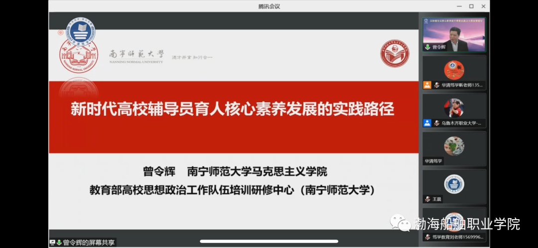 本次培訓依托北京華清篤學教育科技研究院“‘新時代高校輔導員核心素養(yǎng)提升暨輔導員素質能力大賽備賽輔導’線上專題研修班”,主要從“新時代高校輔導員育人核心素養(yǎng)發(fā)展的實踐路徑”、“提升理論素養(yǎng),增進育人能力”、“輔導員素質能力大賽環(huán)節(jié)剖析”、“聚焦主責主業(yè),提升素質能力”、“輔導員素質能力大賽的‘變’與‘不變’”五個方面,圍繞輔導員理論素養(yǎng)的提升、育人方法的養(yǎng)成、素質能力的提高等核心問題進行了培訓。