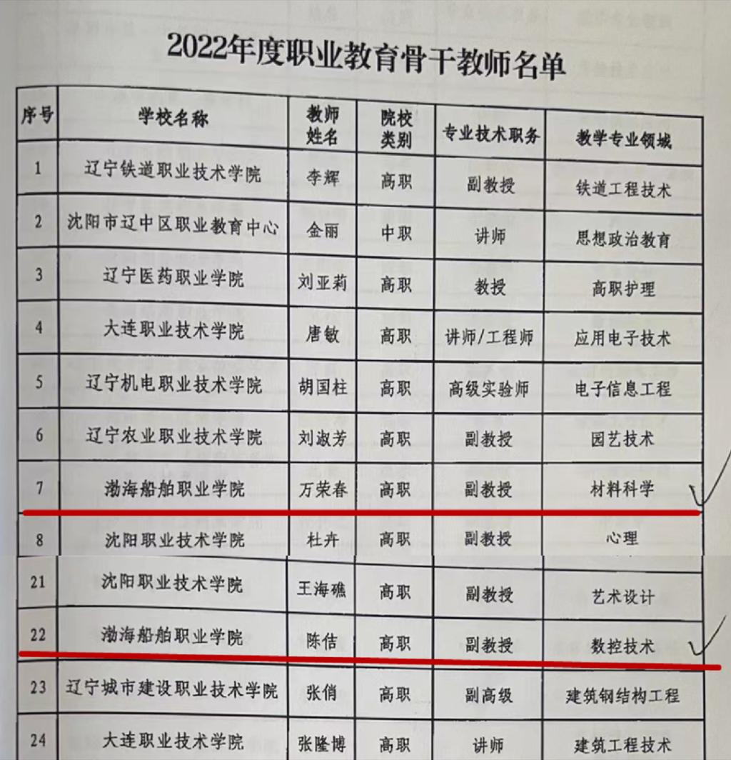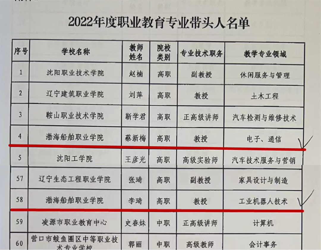 近日,遼寧省教育廳公布2022年度職業(yè)教育興遼職教名師、專業(yè)帶頭人和骨干教師名單。經過學校推薦申報、專家評審、網上公示,確定我院王博、王宏老師為2022年度職業(yè)教育職教名師,蔡新梅、李琦老師為2022年度職業(yè)教育專業(yè)帶頭人,萬榮春、陳佶老師為2022年度職業(yè)教育骨干教師。