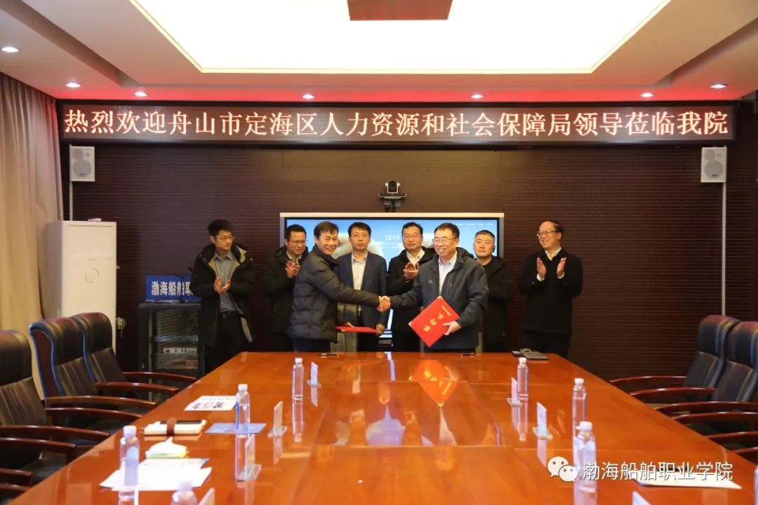 11月18日,渤海船舶職業(yè)學(xué)院與舟山市定海區(qū)人力資源和社會(huì)保障局校政企合作簽約儀式在辦公樓三樓會(huì)議室舉行。舟山市定海區(qū)副區(qū)長劉烈、定海區(qū)人力資源和社會(huì)保障局副局長滕磊,我院院長何滿輝、副院長閆世杰出席簽約儀式。