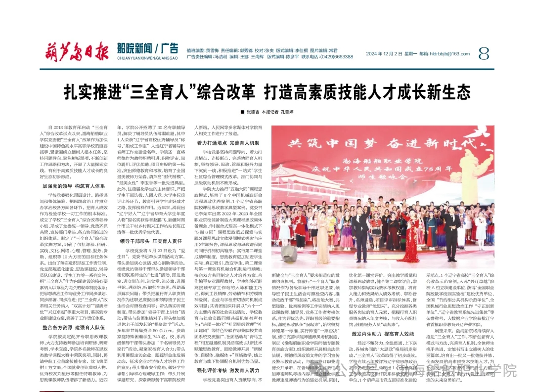 12月2日,《葫蘆島日報》刊發(fā)《扎實推進“三全育人”綜合改革 打造高素質(zhì)技能人才成長新生態(tài)》,對我校“三全育人”改革工作進行報道。