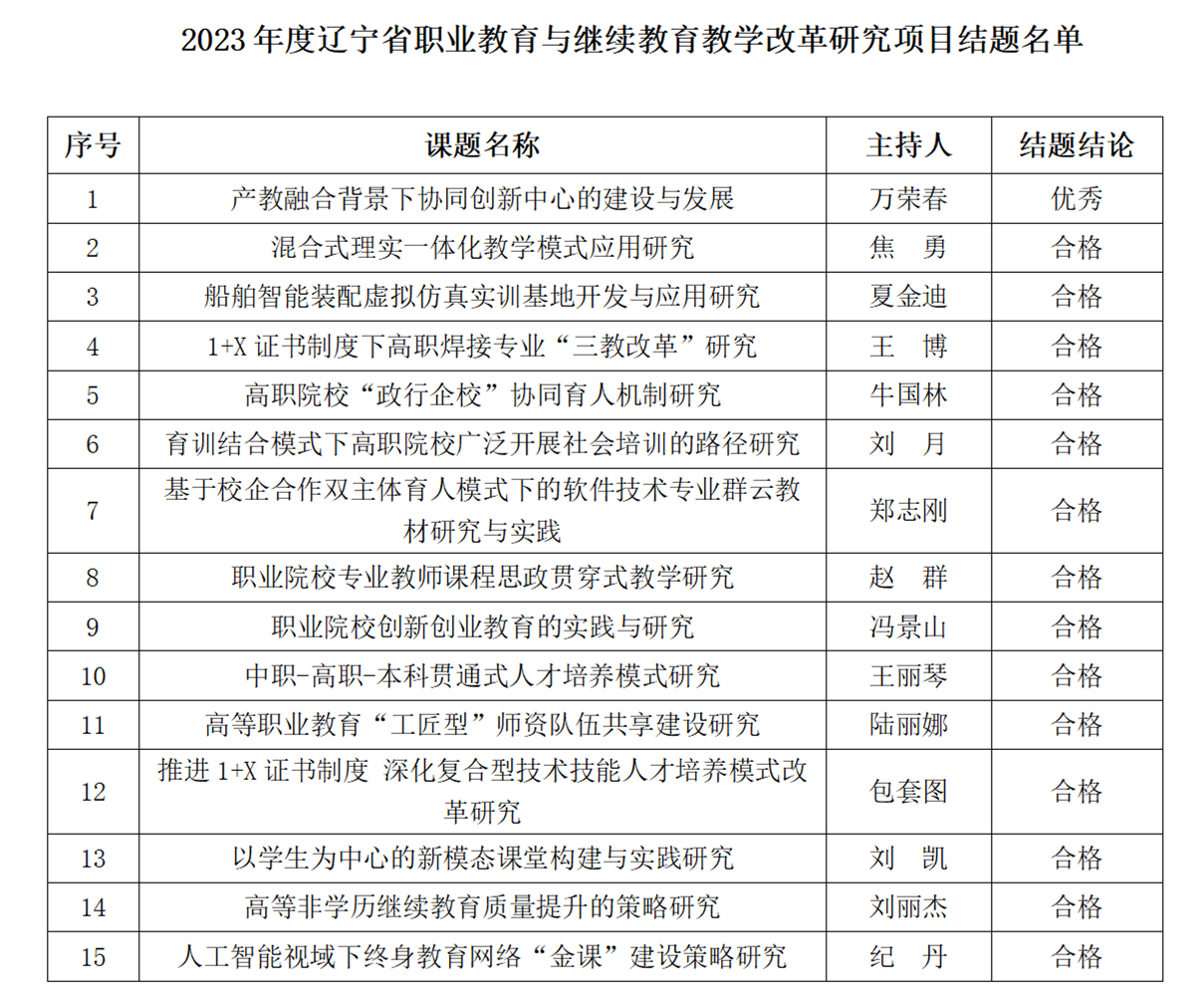 近日,遼寧省教育廳發(fā)布了《關(guān)于公布2023年度遼寧省職業(yè)教育與繼續(xù)教育教學(xué)改革研究項目結(jié)題鑒定結(jié)果的通知》(遼教通[2024]482號)。我校15項教學(xué)改革研究項目通過了結(jié)題驗收。