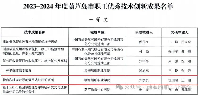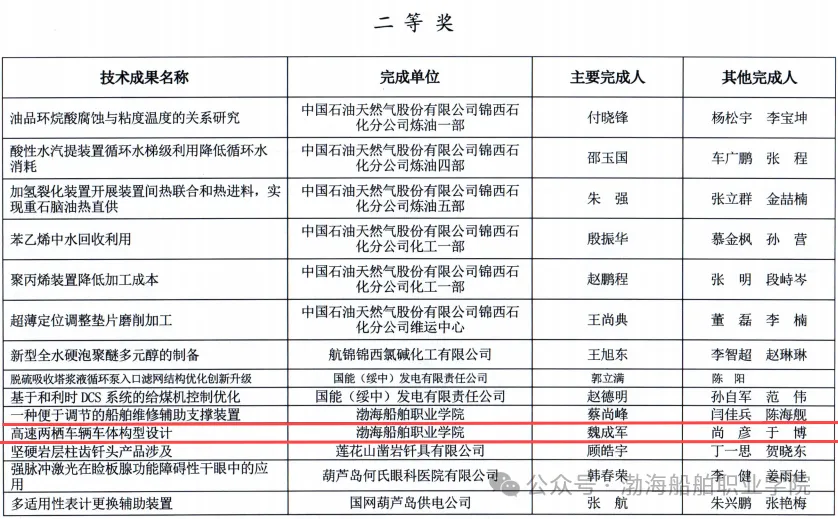 近日,葫蘆島市總工會(huì)、市科學(xué)技術(shù)局聯(lián)合舉辦的葫蘆島市職工優(yōu)秀技術(shù)創(chuàng)新成果推薦活動(dòng)公布獲獎(jiǎng)名單。我校7項(xiàng)成果榮獲一二三等獎(jiǎng)。