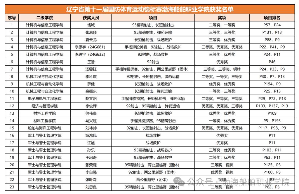 6月20日至22日,2025年遼寧省第十一屆國(guó)防體育運(yùn)動(dòng)錦標(biāo)賽在沈陽(yáng)舉行。我校由學(xué)生處副處長(zhǎng)王磊、劉揚(yáng),金大勇老師,材料工程學(xué)院黨總支副書記寧晨希,軍士與警士管理學(xué)院劉孝剛、高敬濤老師為指導(dǎo)教師,錢誠(chéng)、李科震、高振東、馬興超、湯雯鈺、李思宇、王旨等23名同學(xué)組成代表隊(duì)參加比賽。經(jīng)過(guò)激烈角逐,我校代表隊(duì)榮獲個(gè)人項(xiàng)目一等獎(jiǎng)4個(gè),二等獎(jiǎng)5個(gè),三等獎(jiǎng)9個(gè),優(yōu)秀獎(jiǎng)10個(gè);團(tuán)體項(xiàng)目三等獎(jiǎng)1個(gè),優(yōu)秀獎(jiǎng)2個(gè),銅牌1個(gè),學(xué)校被大賽組委會(huì)授予“國(guó)防體育運(yùn)動(dòng)推廣優(yōu)秀單位”。