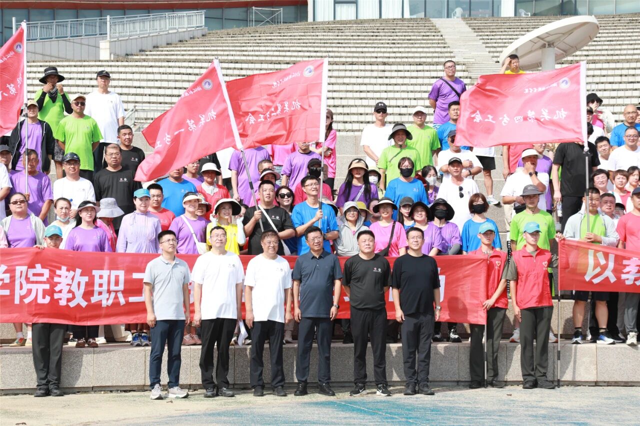 黨委書記李榮軍宣布活動(dòng)開始,校長(zhǎng)何滿輝鳴槍發(fā)令,各分工會(huì)隊(duì)伍緊跟校旗有序行進(jìn)。