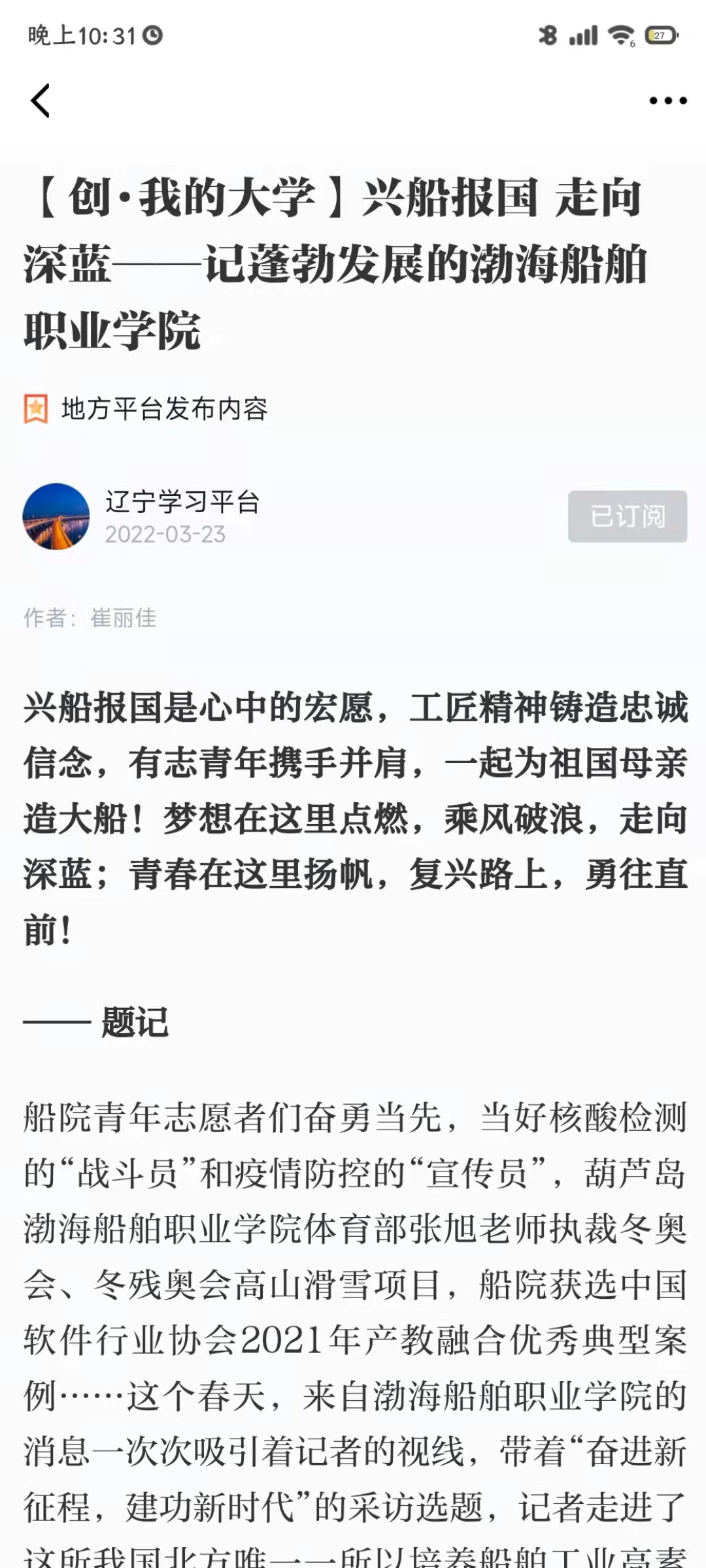 船院青年志愿者們奮勇當(dāng)先,當(dāng)好核酸檢測的“戰(zhàn)斗員”和疫情防控的“宣傳員”,船院體育部張旭老師執(zhí)裁冬奧會、冬殘奧會高山滑雪項(xiàng)目,船院獲選中國軟件行業(yè)協(xié)會2021年產(chǎn)教融合優(yōu)秀典型案例……這個春天,來自渤海船舶職業(yè)學(xué)院的消息一次次吸引著記者的視線,帶著“奮進(jìn)新征程,建功新時代”的采訪選題,記者走進(jìn)了這所我國北方唯一一所以培養(yǎng)船舶工業(yè)高素質(zhì)技能型人才為主的國家示范性骨干高等職業(yè)學(xué)院。
