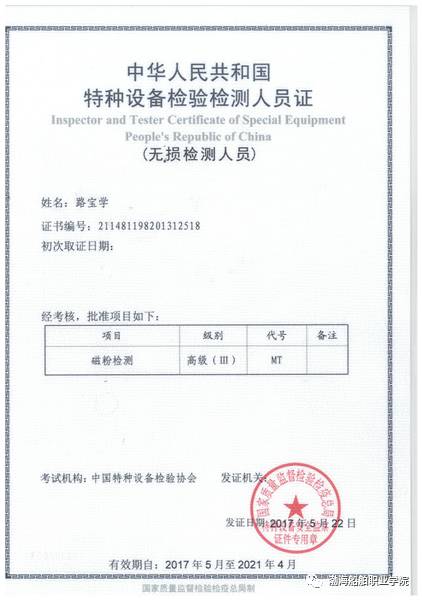 通過(guò)相關(guān)專(zhuān)業(yè)培訓(xùn)、專(zhuān)題性學(xué)習(xí),材料工程系李麗茹、路寶學(xué)老師取得磁粉檢測(cè)高級(jí)資格證書(shū);李麗茹、魏同鋒、魏寧老師取得超聲檢測(cè)高級(jí)資格證書(shū);路寶學(xué)、魏同鋒老師取得滲透檢測(cè)高級(jí)資格證書(shū)。