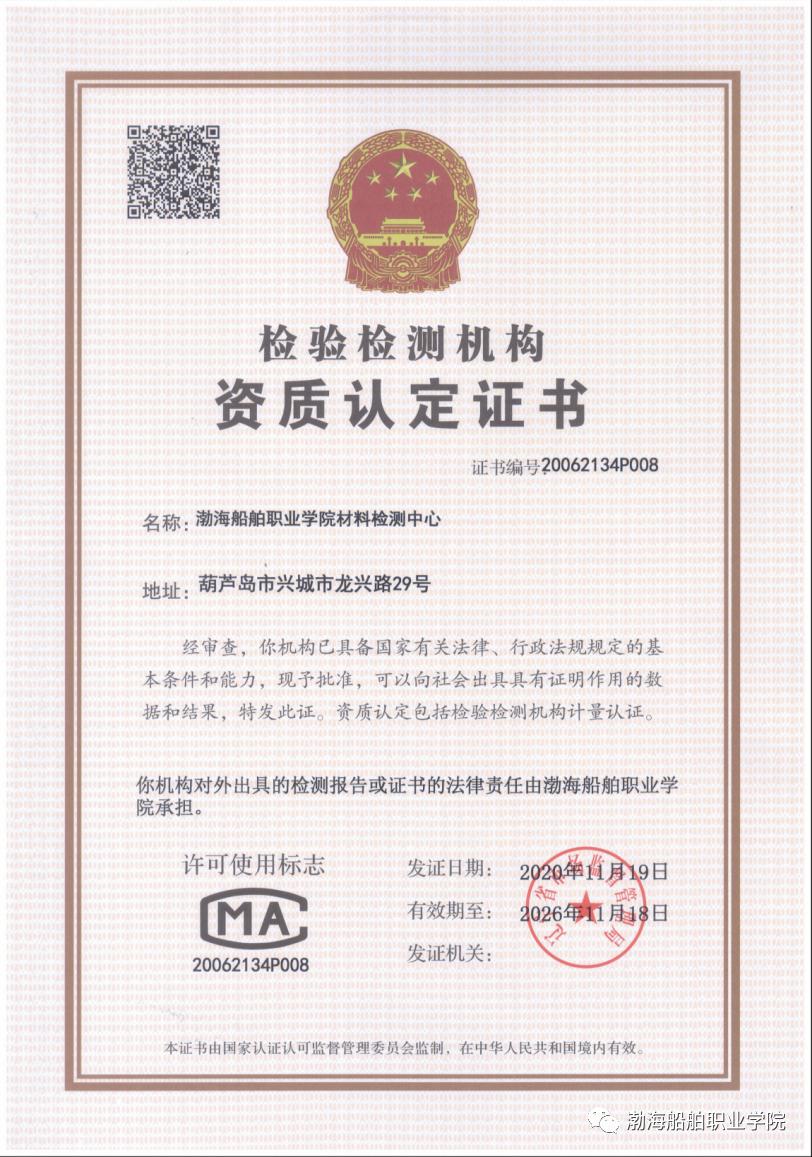 11月19日,學(xué)院材料檢測中心獲得國家檢驗檢測機構(gòu)資質(zhì)認(rèn)定證書(CMA,China Inspection Body and Laboratory Mandatory Approval),成為葫蘆島地區(qū)首家通過CMA認(rèn)證的金屬材料類檢測機構(gòu)。