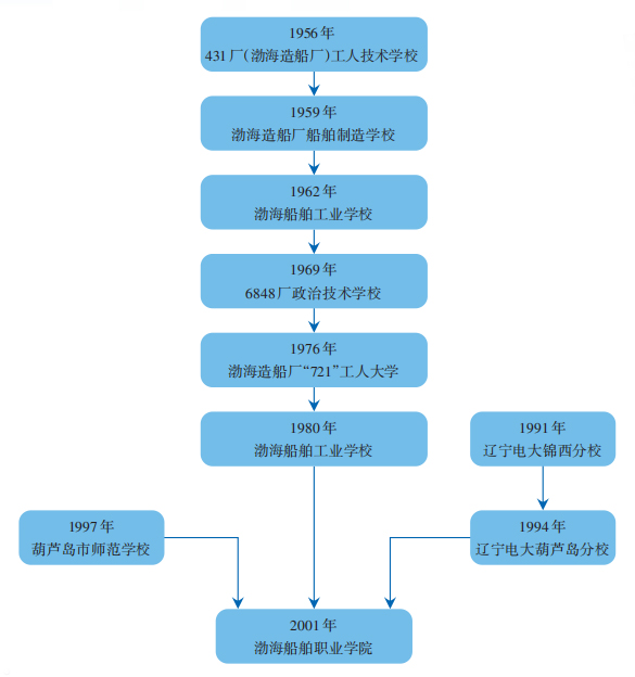 2001年,經(jīng)遼寧省政府批準(zhǔn),渤海船舶工業(yè)學(xué)校與葫蘆島廣播電視大學(xué)、師范學(xué)校合并組建渤海船舶職業(yè)學(xué)院,劃歸地方,實(shí)行省市共建。